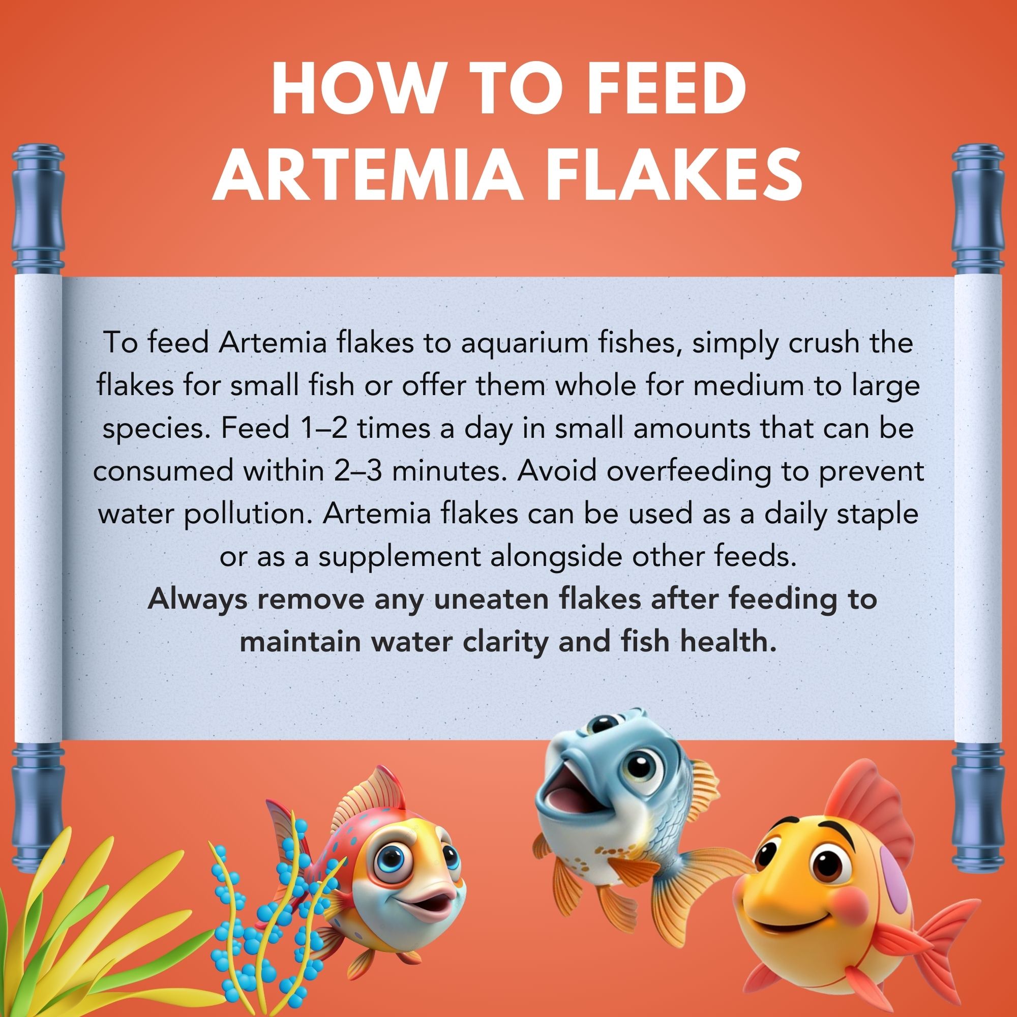 Feed EXYMO Artemia Flakes directly 1–2 times daily in amounts your fish can consume within 2–3 minutes. Adjust based on fish size and number to avoid overfeeding and maintain water quality.