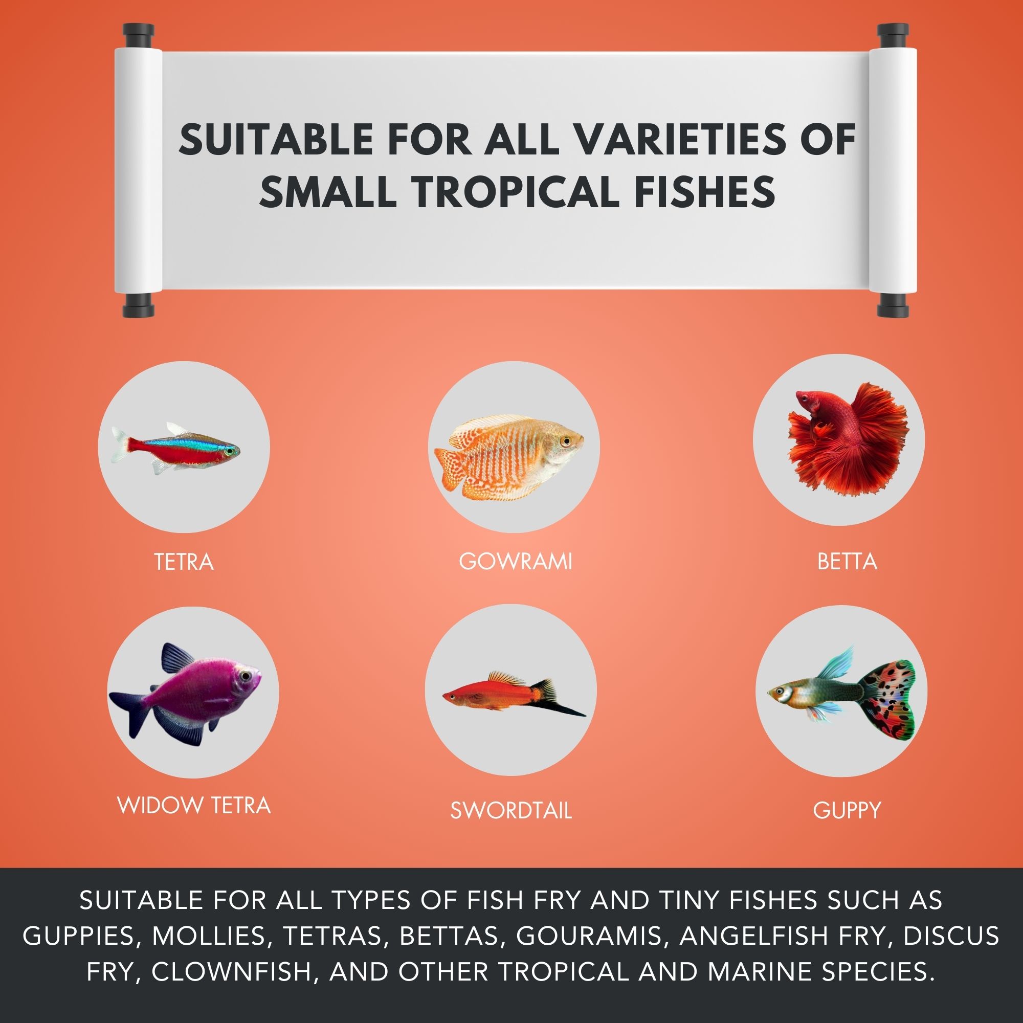 Guppies, Guppy Fish, Betta, Betta Fish, Mollies, Platies, Gouramis, Tetras, and other small tropical aquarium fishes.
