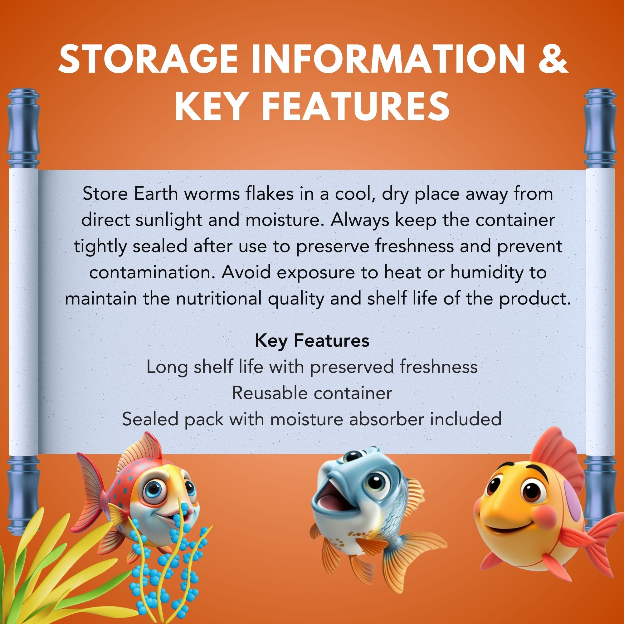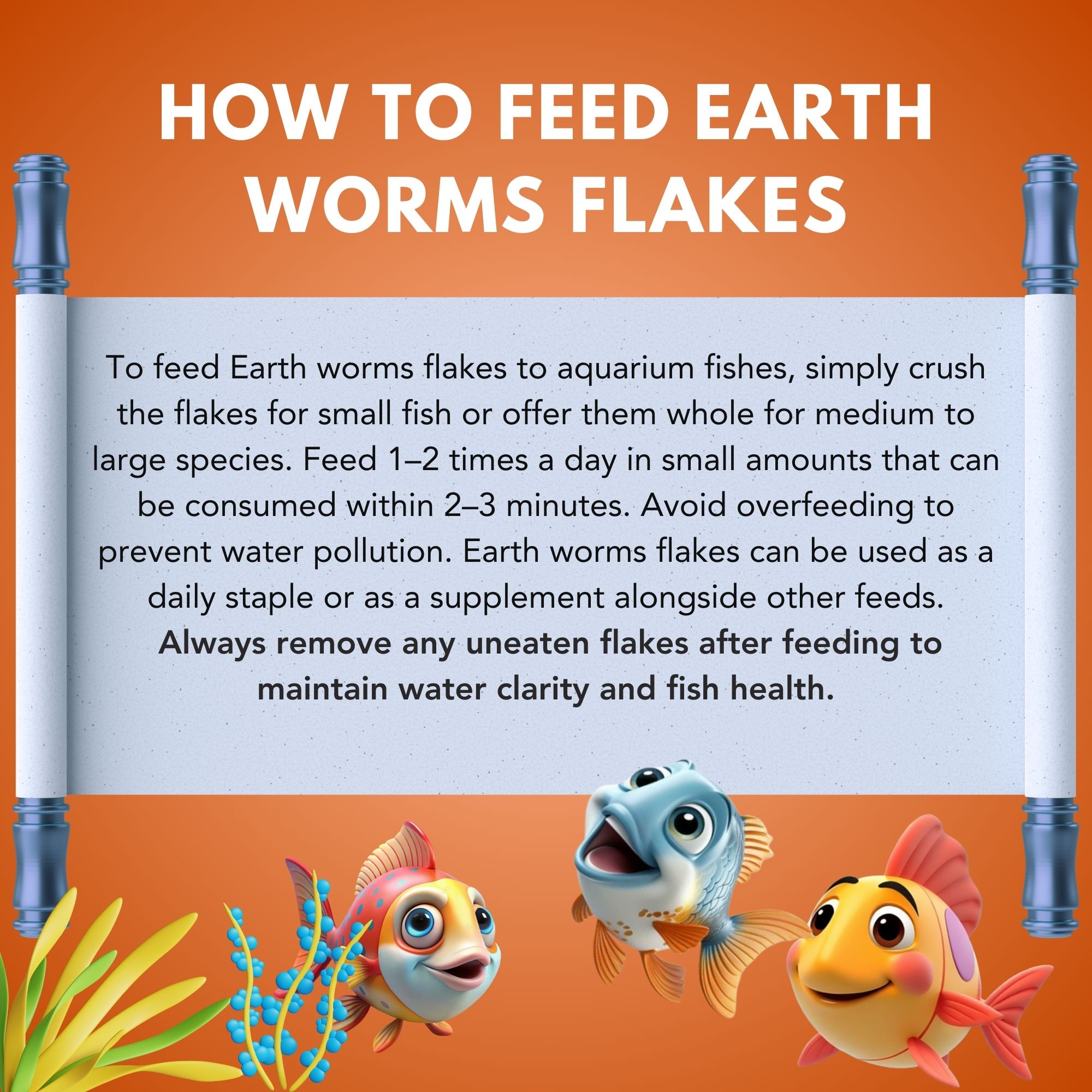 Feed EXYMO Earth Worm Flakes directly 1–2 times daily in small amounts. Only provide what your fish can consume in 2–3 minutes to maintain water quality.