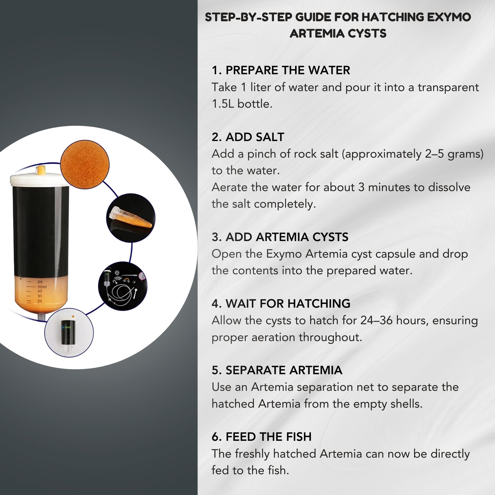Place an EXYMO Artemia Capsule in clean water with gentle aeration. Within 24 hours, live baby brine shrimp will hatch and can be fed directly to fry using a dropper or pipette. The hatchlings are perfectly sized for small tropical fish fry, including Betta, Guppies, and other ornamental species.
