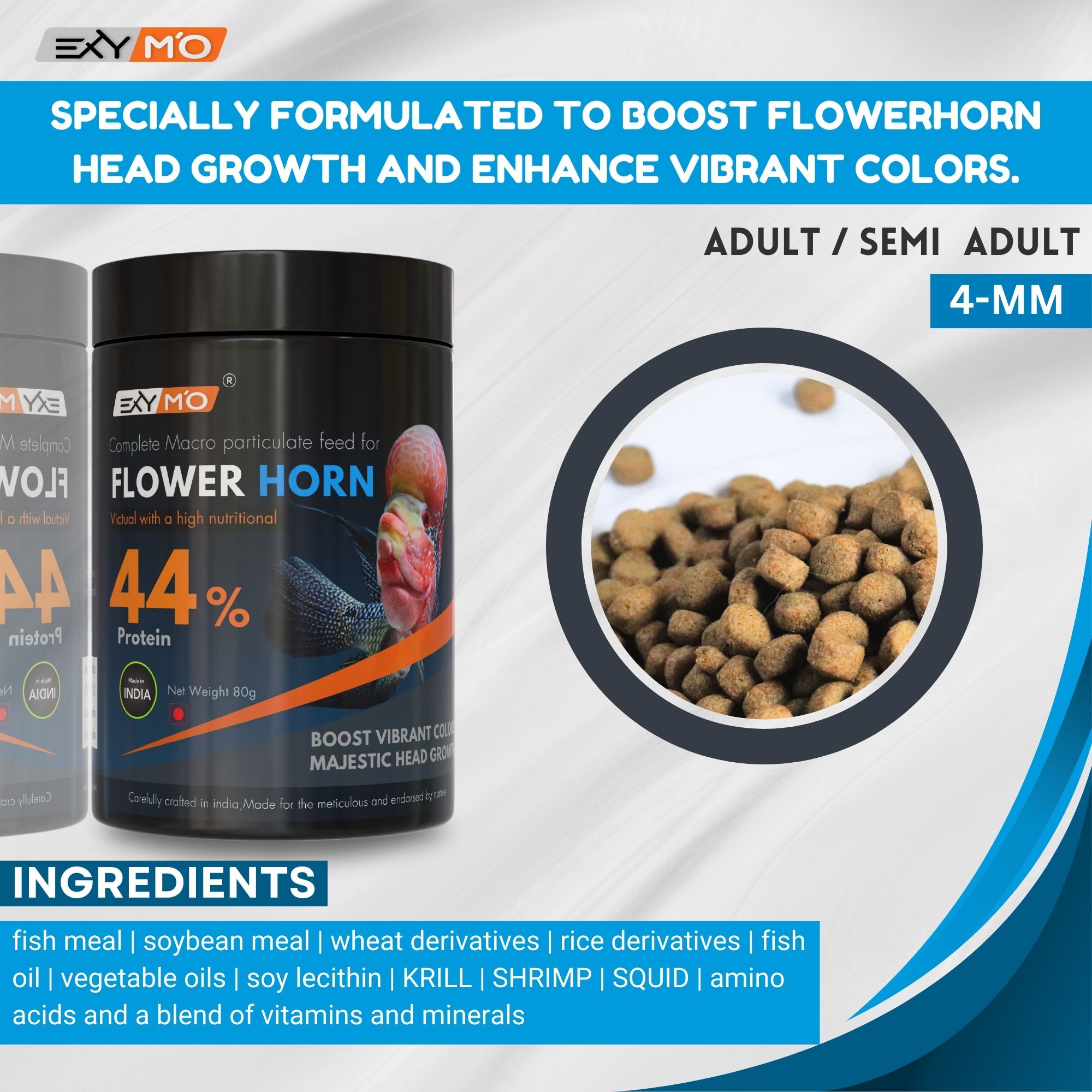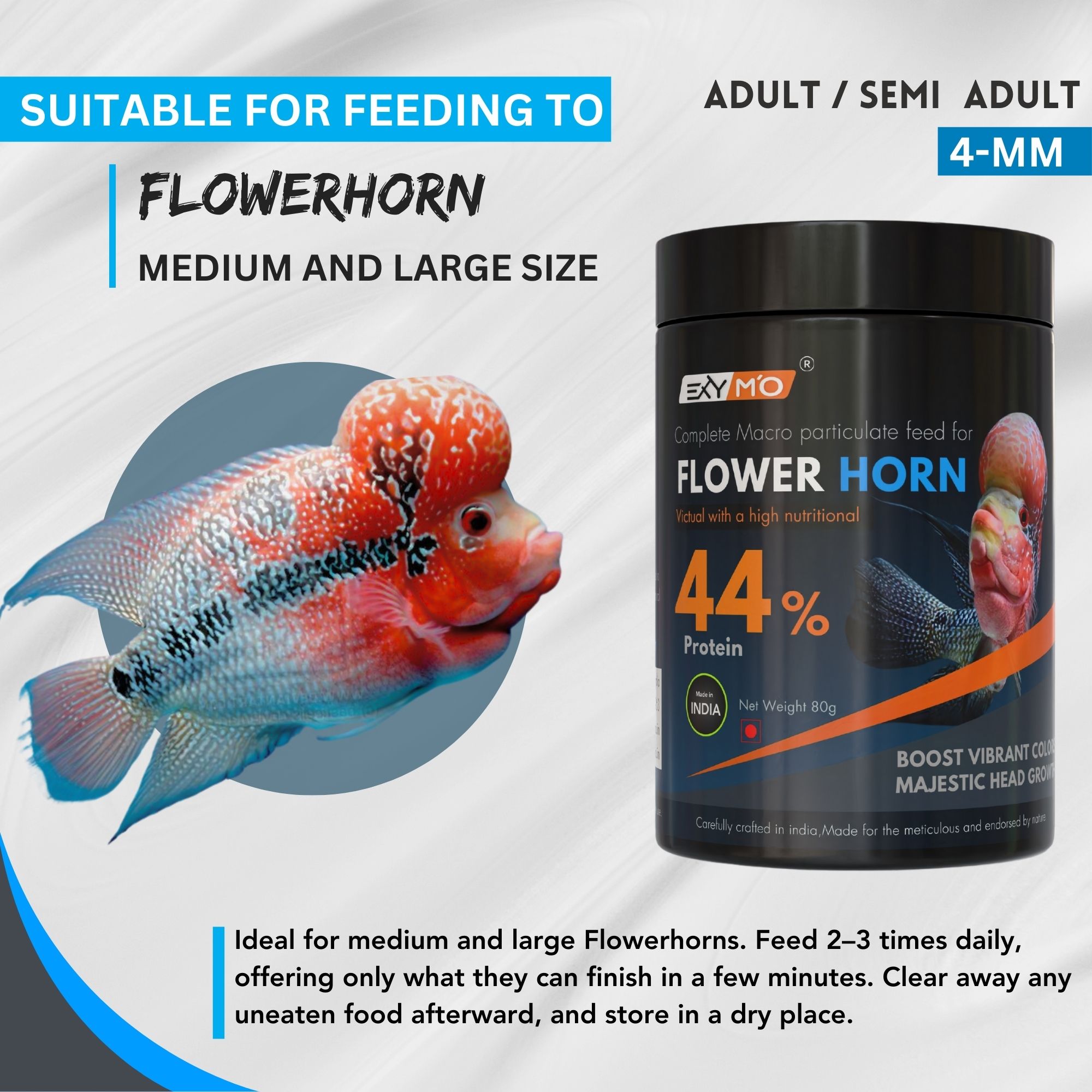 EXYMO Flowerhorn Pellet – premium, protein-rich feed for strong, healthy, and colorful large tropical fishes.